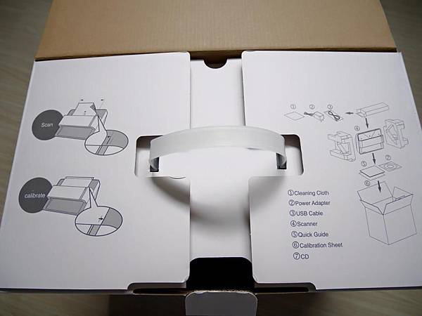盒子裡面有著掃描器主機、USB線、電源線、使用說明書以及安裝光碟
