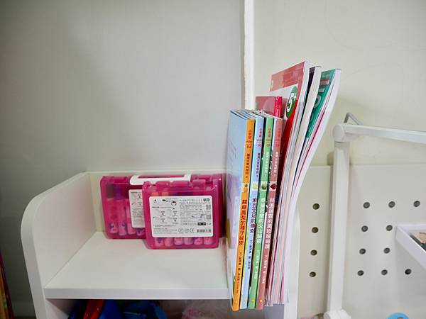 儲物書架的部分,左邊有置物層板,可以放常用書籍、作業本、彩色筆等;