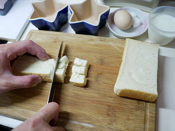 準備一片吐司(依照烤盅大小決定用量)、鮮奶油50g、牛奶50g、砂糖10g、雞蛋 一顆、(葡萄乾可加可不加)