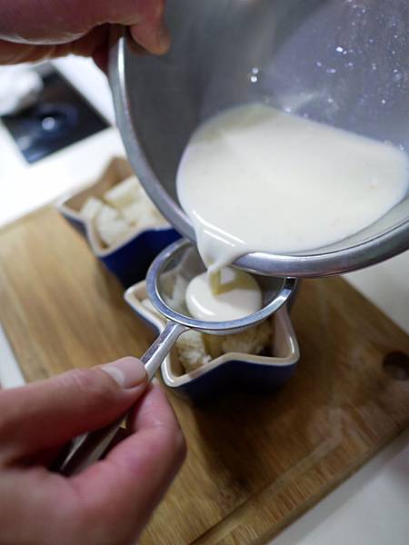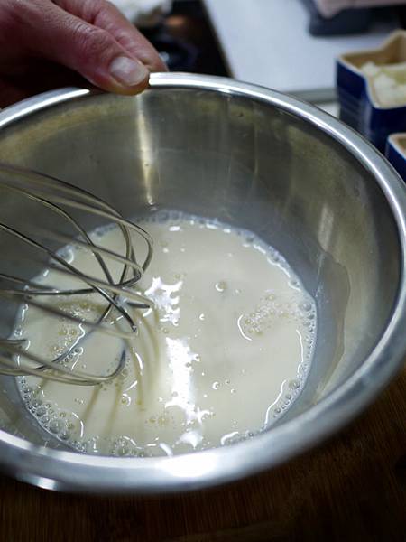 將蛋和砂糖均勻攪拌,再將鮮奶油及牛奶倒入攪拌均勻就完成了布丁液